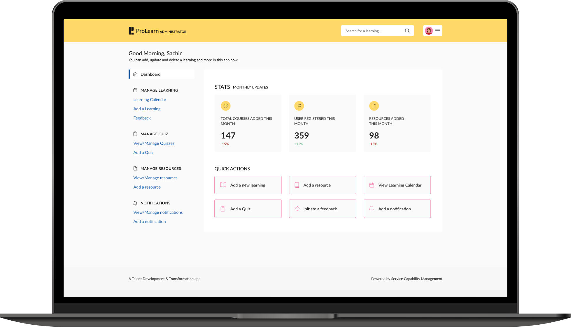 My Learning Plan acts like mini dashboard. Employees can find their progress from this page. This section also includes wishlisted programs, Rgistered trainings and Added KSS.